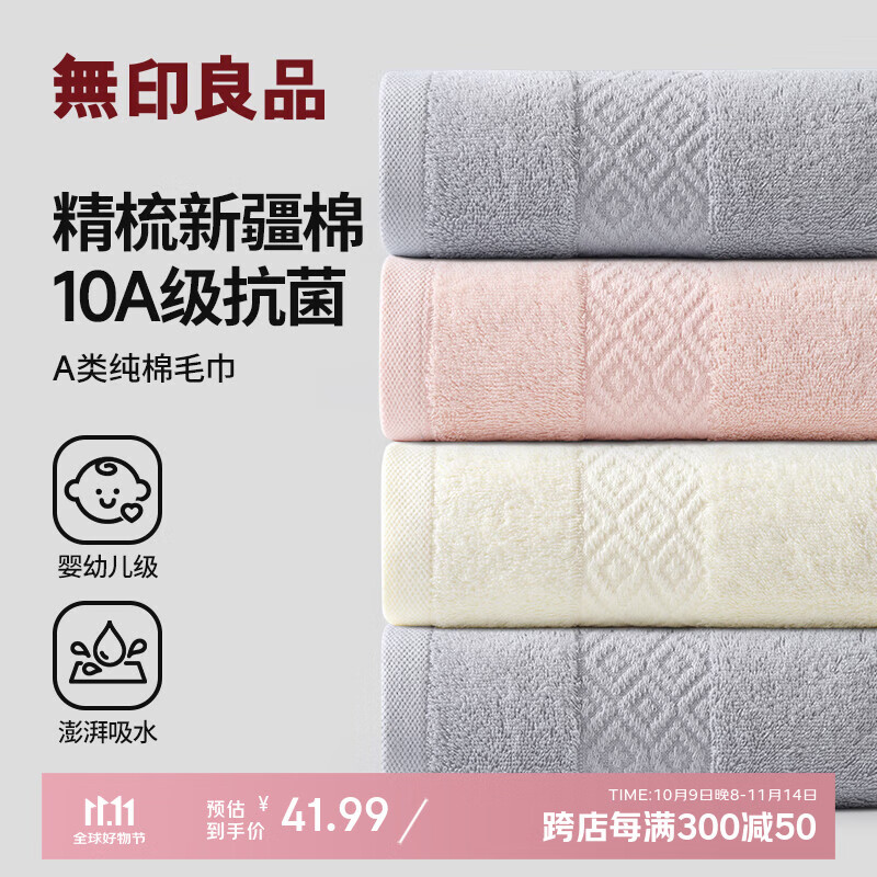 无印良品毛巾4条装10A级抗菌新疆棉亲肤柔软100%纯棉家庭企采洗脸擦脸巾