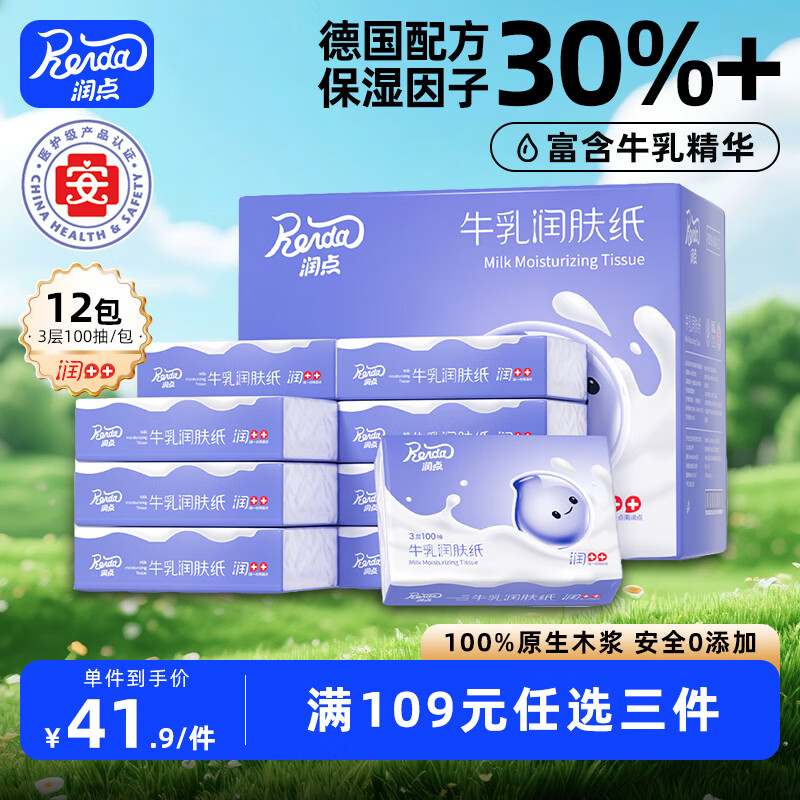 润点婴儿纸巾云柔巾乳霜纸3层100抽12包宝宝保湿纸巾柔纸巾牛乳纸擦手
