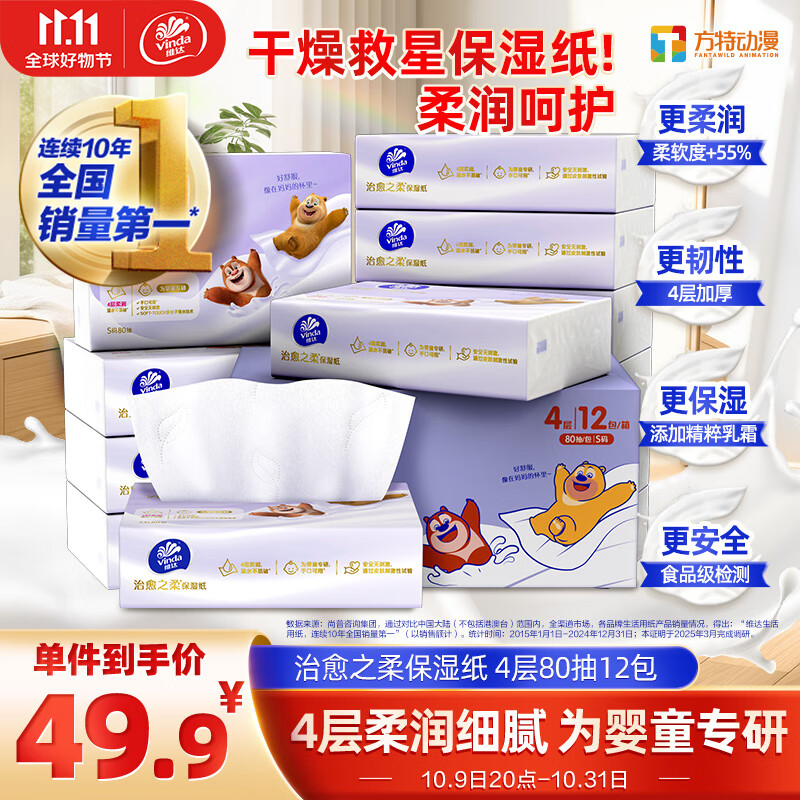 维达(Vinda)抽纸 保湿纸巾4层80抽*12包 加厚婴儿乳霜纸云柔巾 宝宝专用 整箱