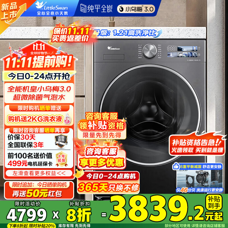 小天鹅(LittleSwan)12公斤滚筒洗衣机全自动家用 纯平全嵌 小乌梅3.0高奢版 除菌变频1.21洗净比一级能效国家补贴20% TG12VE40PRO