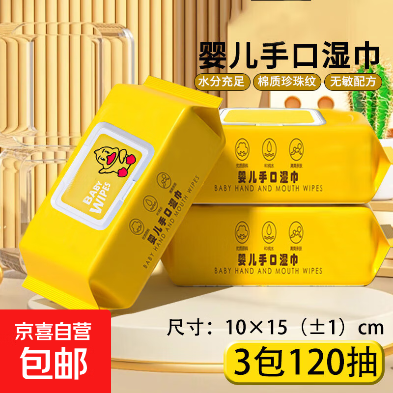 婴儿湿巾新生儿宝宝专用加大厚手口湿巾擦脸清洁屁屁卫生纸巾护理 120抽 3包
