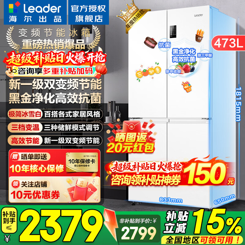 海尔冰箱出品统帅473升四开门十字对开门白色风冷无霜一级能效变频节能Leader电冰箱 冰雪白+双变频新一级+黑金净化