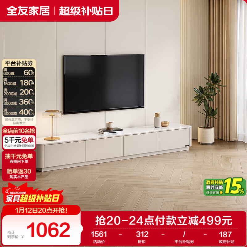 全友家居现代简约电视柜客厅储物柜钢化玻璃台面靠墙落地桌子政府补贴
