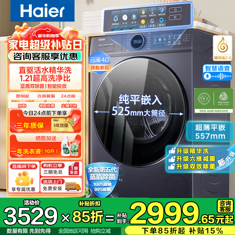 海尔(Haier)云溪4.0洗衣机77E全自动滚筒洗衣机10kg直驱超薄洗烘一体机带烘干活水精华洗羊毛绿标以旧换新补贴 单洗 活水精华洗+1.21洗净比+蓝盾除菌+羊毛绿标