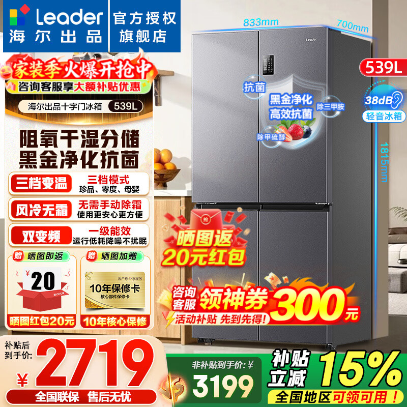 海尔冰箱出品539升四开门十字对开门风冷无霜一级双变频干湿分储统帅560电冰箱以旧换新 阻氧干湿分储+黑金净化+一级双变频