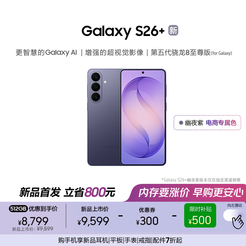 三星Galaxy S26+ AI手机 第五代骁龙8至尊版游戏手机 2K超清拍照手机 政府补贴 256GB升杯512GB 幽夜紫