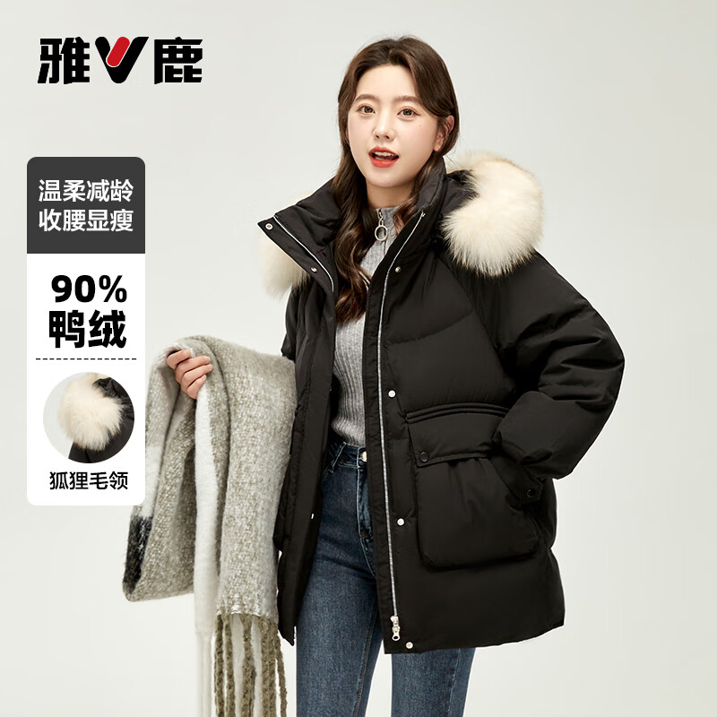 雅鹿女士羽绒服中长款可脱卸帽狐狸毛领甜美百搭保暖外套 黑色 155