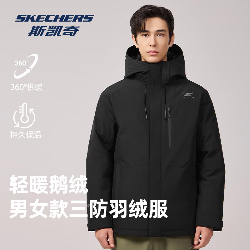 斯凯奇鹅绒羽绒服男女款2025冬季新年户外连帽运动外套三防保暖百搭冬装
