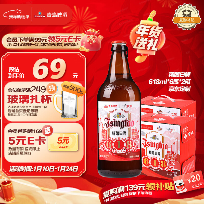 青岛啤酒 德式小麦 精酿白啤 618ml*6瓶*2箱 京东定制 礼盒装 年货送礼