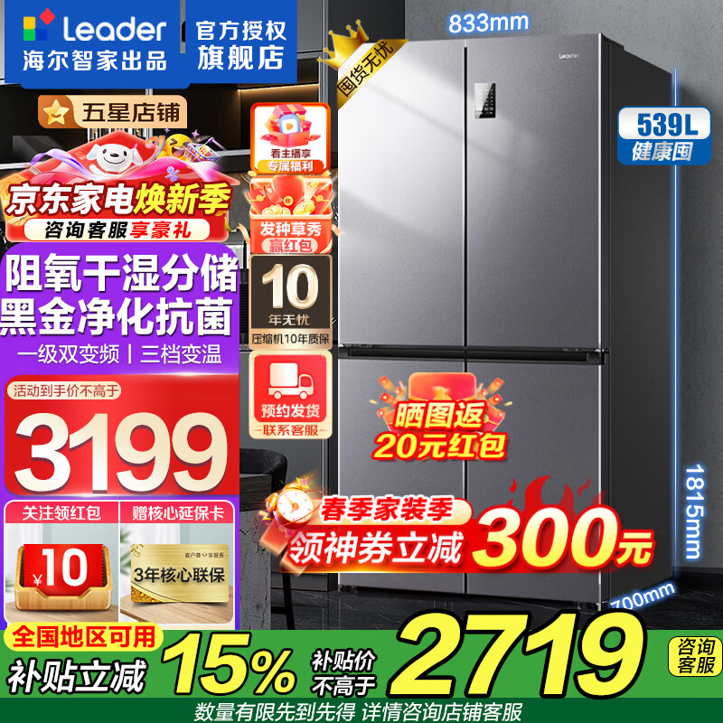 海尔冰箱出品560四开门十字对开门539升家用大容量风冷无霜一级能效双变频阻氧干湿分储统帅冰箱 539升阻氧干湿分储+黑金净化抑菌+一级双变频