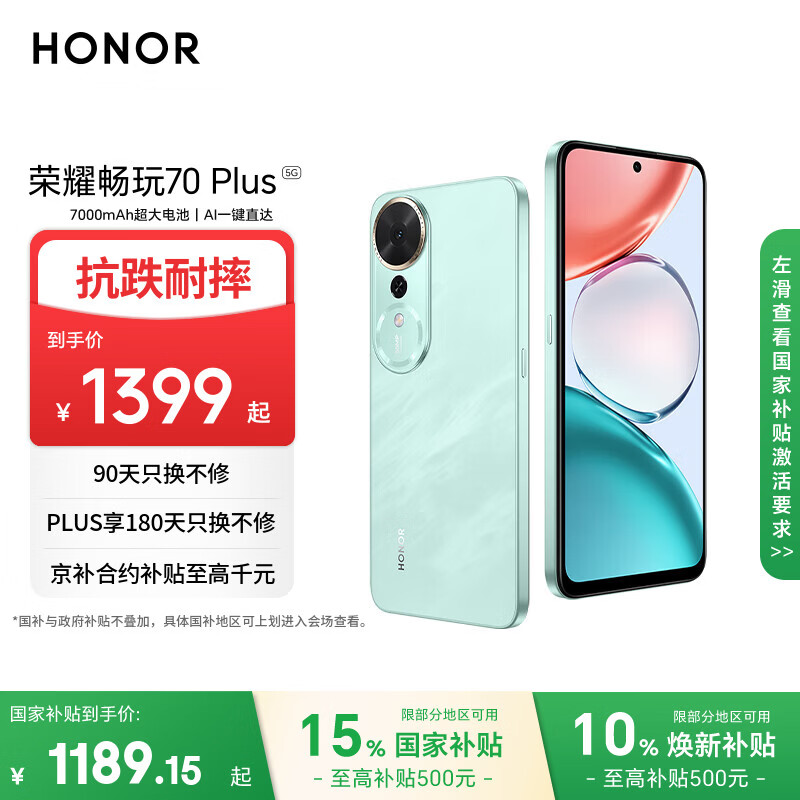 荣耀畅玩70 Plus 新款大屏AI 7000mAh超大电池 骁龙6系芯片 AI一键直达 12+256晓山青 5G手机 国家补贴