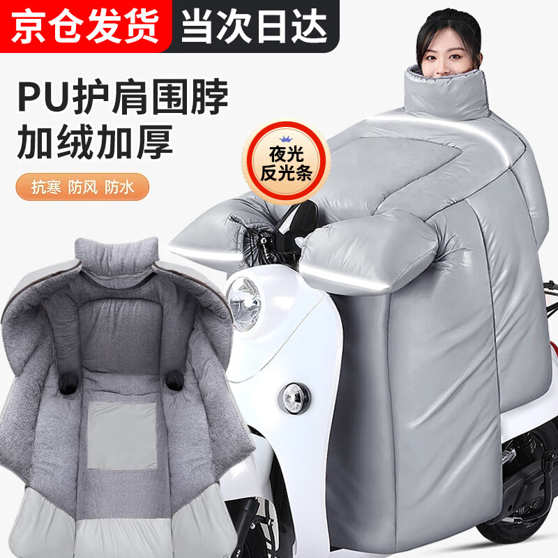 京家洁电动车挡风被冬季加绒加大加厚2025新款电瓶车防水挡风被摩托车 PU小羊皮-灰色【护肩围脖加厚款】