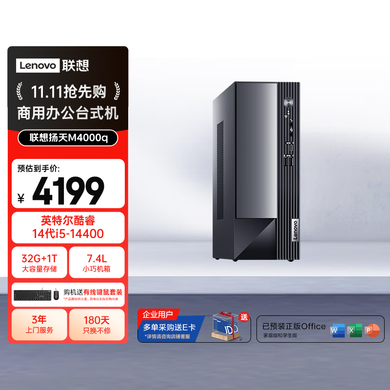 联想(Lenovo)扬天M4000q 商用办公台式电脑台式机主机(酷睿14代i5-14400 32G 1TB SSD win11 Office)单主机