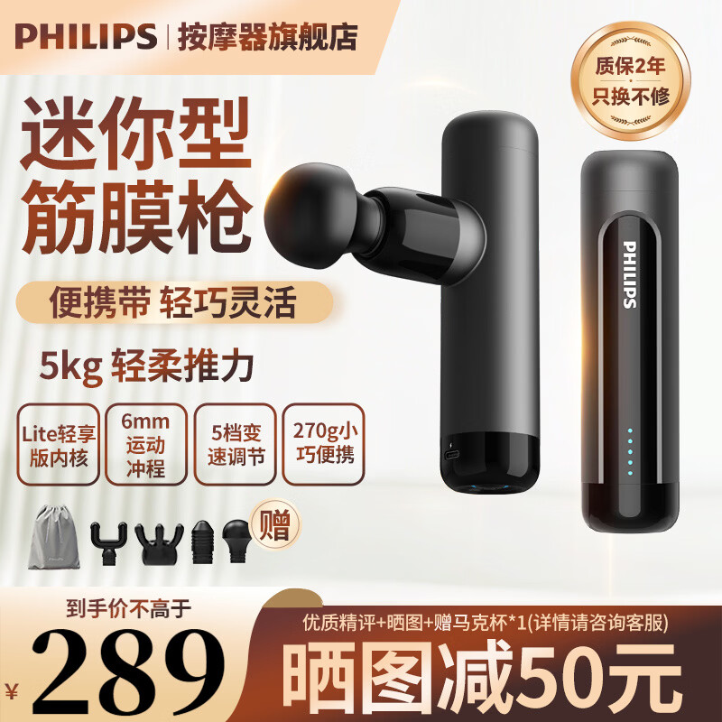 飞利浦(PHILIPS)筋膜枪按摩器 轻量便携迷你筋膜枪 运动健身肌肉放松捶打筋膜枪按摩仪 节日送男女友家人实用礼物 迷你筋膜枪3105G(送4头)