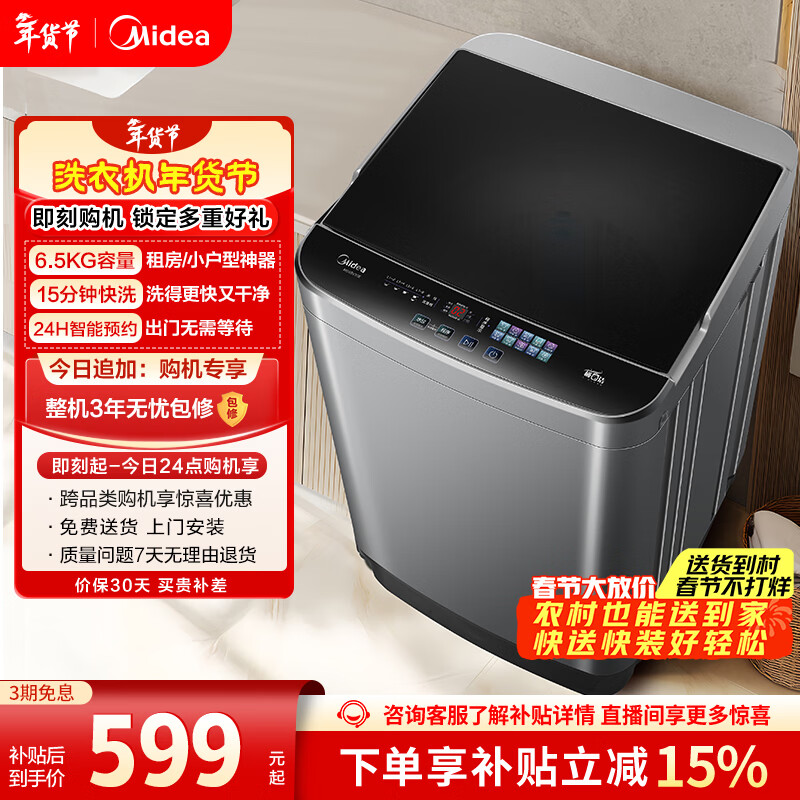 美的(Midea)随心洗 波轮洗衣机全自动 6.5公斤 小型租房用 专利免清洗 MB65V36E 以旧换新 京东自营