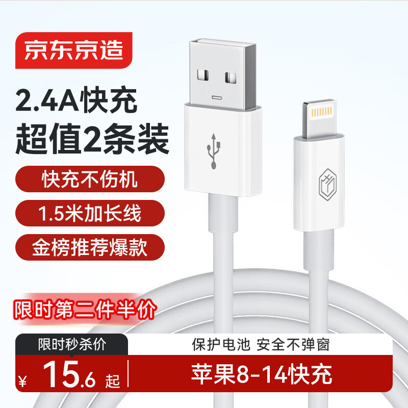 京东京造 【两条装】苹果快充数据线2.4A充电线适用iPhone14/13/12/11Pro xs/iPadPro/mini平板车载1.5米