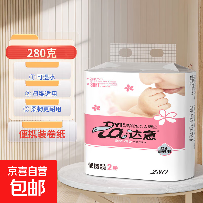 达意便携卷纸原生木浆妇婴卫生纸5层加厚可湿水卫生纸厕纸纸巾 140g×2卷(共280g)
