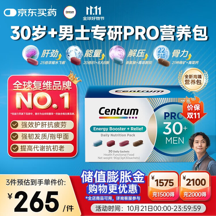 善存海外重磅新品PRO营养包男性30岁复合维生素茶氨酸南非醉茄30袋/盒