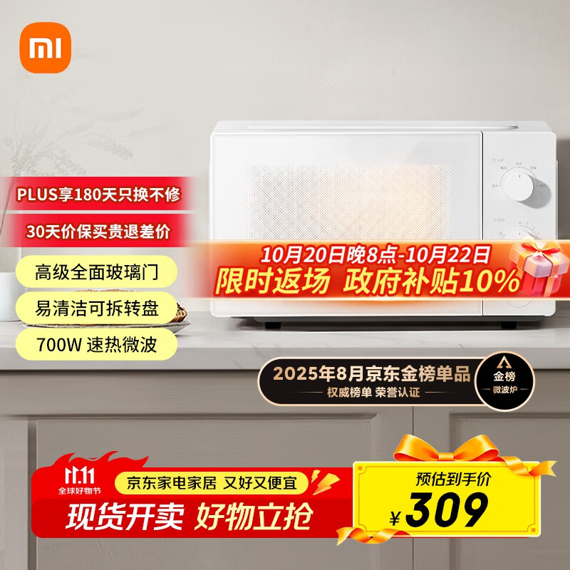 米家小米微波炉家用小型多功能 小尺寸可拆转盘式 大火力均匀加热 机械式双旋钮易操作 台式大容量20升