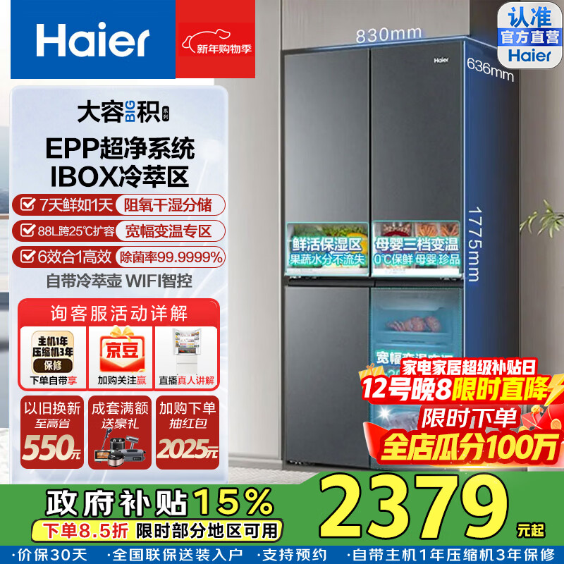 海尔家宴473L十字门冰箱EPP超净三档变温IBOX冷萃区宽幅变温一级能效风冷无霜除菌净味家用电冰箱 BCD-473WGHTDH9G9U1