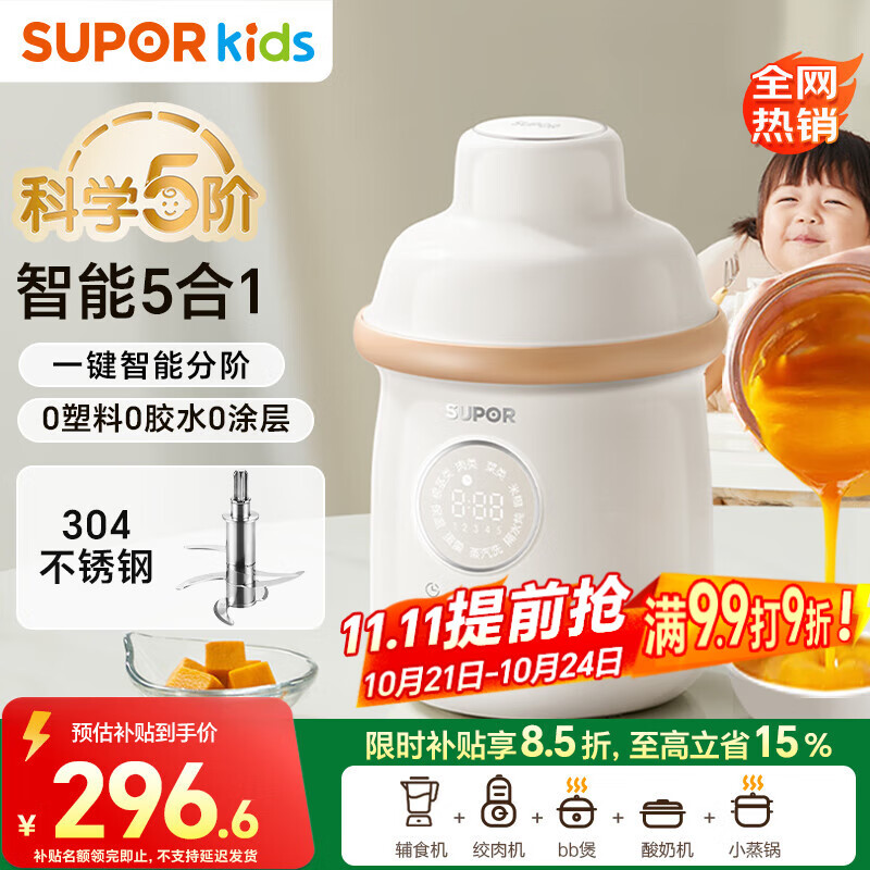 苏泊尔(SUPOR)宝宝辅食机 婴儿辅食锅蒸煮搅一体多合一工具 6叶单杯全钢刀 FB18