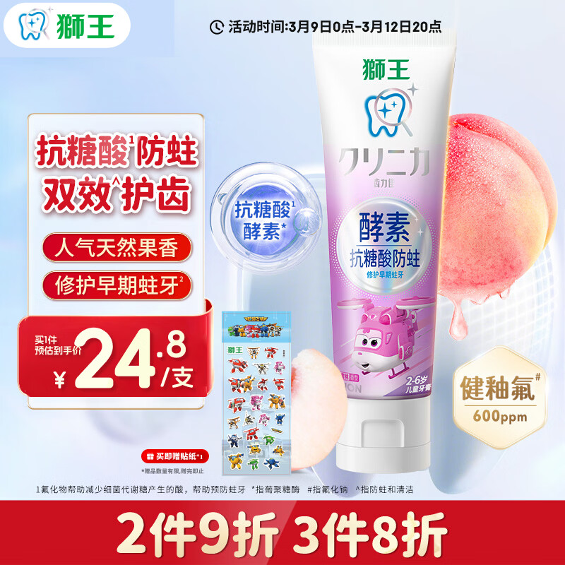 狮王(Lion)齿力佳儿童酵素抗糖防酸蛀牙膏2-6岁蜜桃味60g