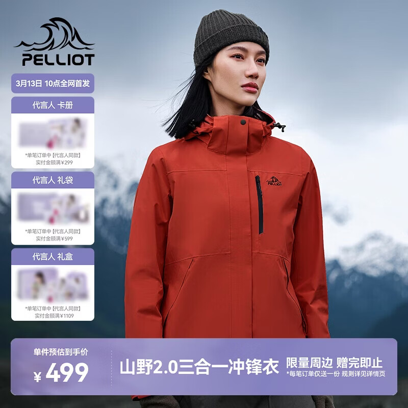 伯希和(Pelliot)【山野经典2.0】冲锋衣三合一春秋男女户外防风外套12340106红M