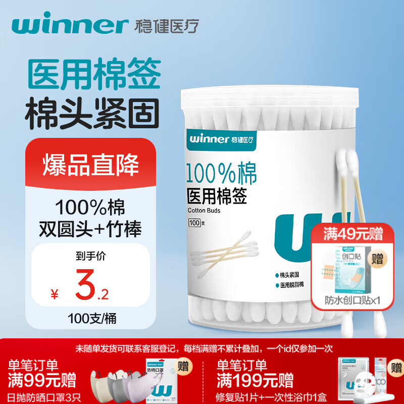 稳健出行医用棉签双头掏耳鼻清洁化妆脱脂棉棉棒白色7.5cm100支/桶