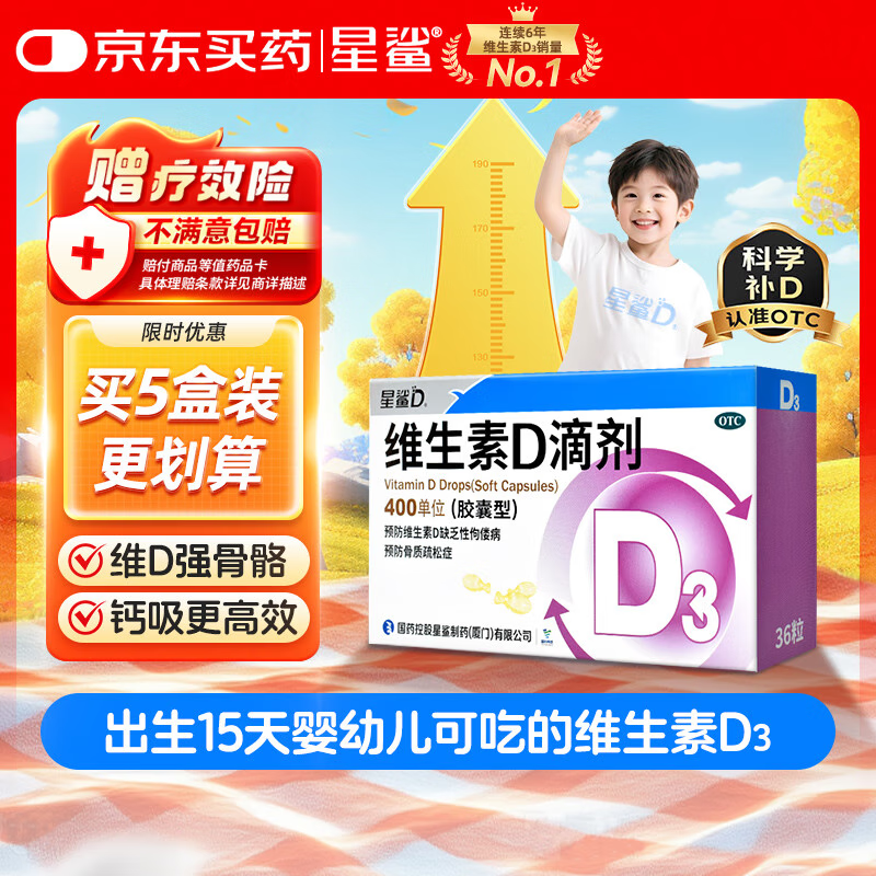 星鲨维生素D3滴剂(胶囊型)36粒 d3儿童维生素D促钙吸收长高 补钙 京东自营非ad滴剂 孕妇 新出生15天可吃