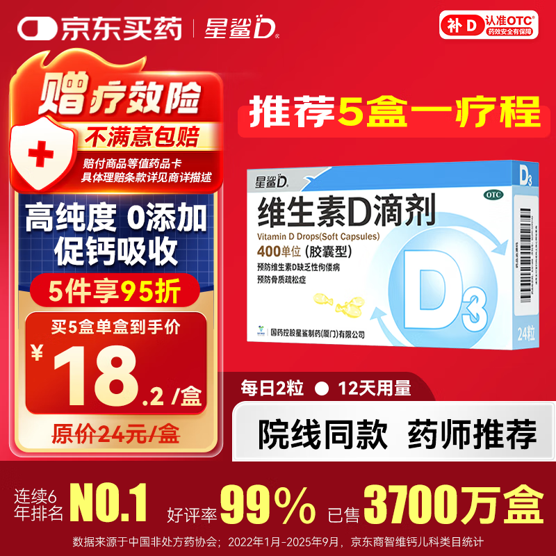 星鲨【无效包赔】维生素d3滴剂(胶囊型)24粒 d3婴儿婴幼儿儿童维生素D促钙吸收长高 补钙 京东自营非维生