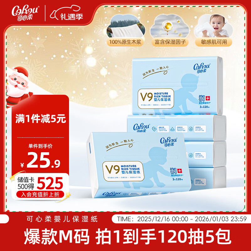 可心柔(COROU)抽纸 云柔巾 婴儿纸巾 3层120抽*5包 M码 柔润乳霜纸100%原生木浆