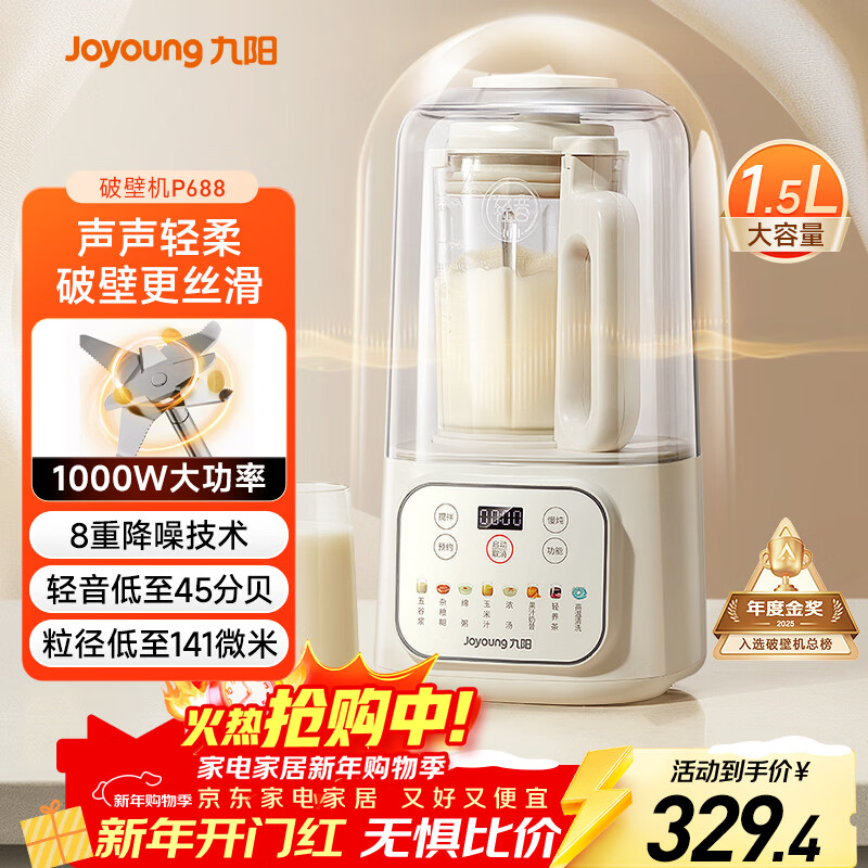 九阳1.5L低音破壁机家用全自动豆浆机轻音45分贝2-4人降噪榨汁料理机五谷杂粮破壁机P688