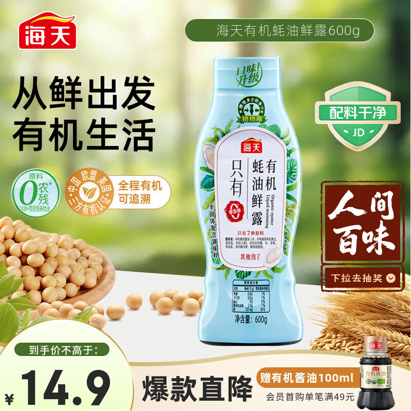 海天 蚝油600g 有机鲜露【0添加 有机】挤挤装 炒蘸腌拌增香 配料干净