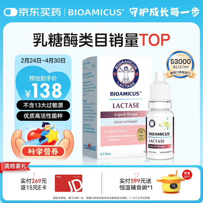 BIOAMICUS乳糖酶滴剂乳糖不耐受酸性53000型原装进口高活性酶14ml*1盒