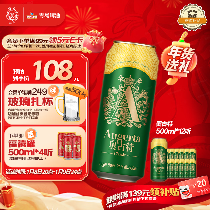 青岛啤酒(TsingTao)奥古特原麦汁浓度12°P 500ml*12听大罐箱装新老版随机发年货送礼