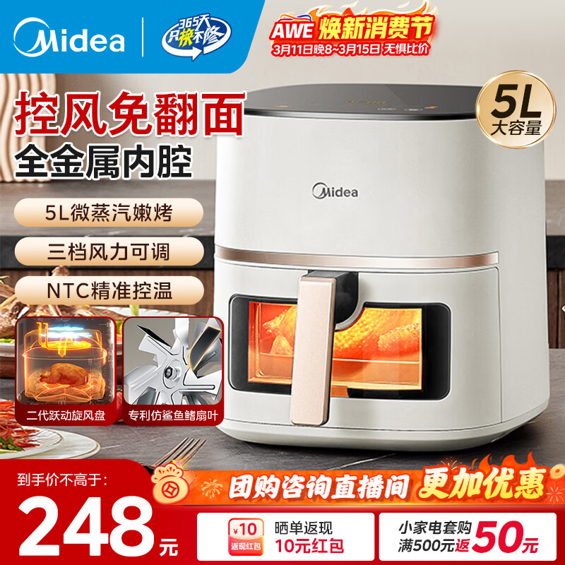 美的(Midea)空气炸锅不用翻面可视大容量家用全自动烤箱多功能不粘易洗触控微蒸汽嫩烤免翻面炸烤一体 KZC5089【风力可调】金属内腔 5L