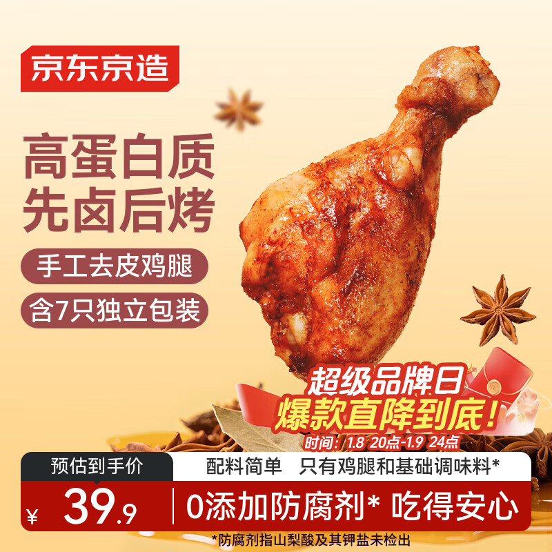 京东京造高蛋白烤鸡腿525g 卤香7只整去皮鸡腿即食健身减肥减脂期代餐零食