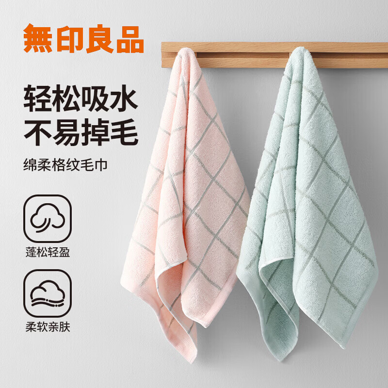 无印良品毛巾7A抗菌A类快速吸水洗脸面巾纯棉非纯棉珊瑚绒洗脸巾 经典格子款【粉+蓝】 2条