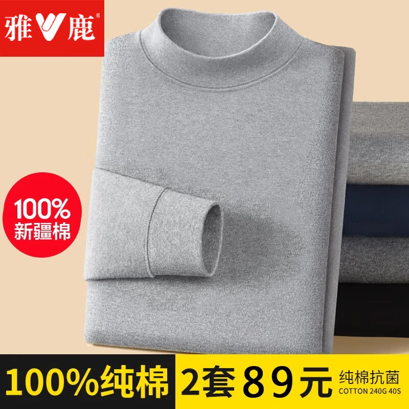 雅鹿【2套纯棉】中领秋衣秋裤男士保暖内衣男薄款套装秋冬季全棉毛衫 黑色+深麻灰【中领2套装】 2XL 【建议120-150斤】
