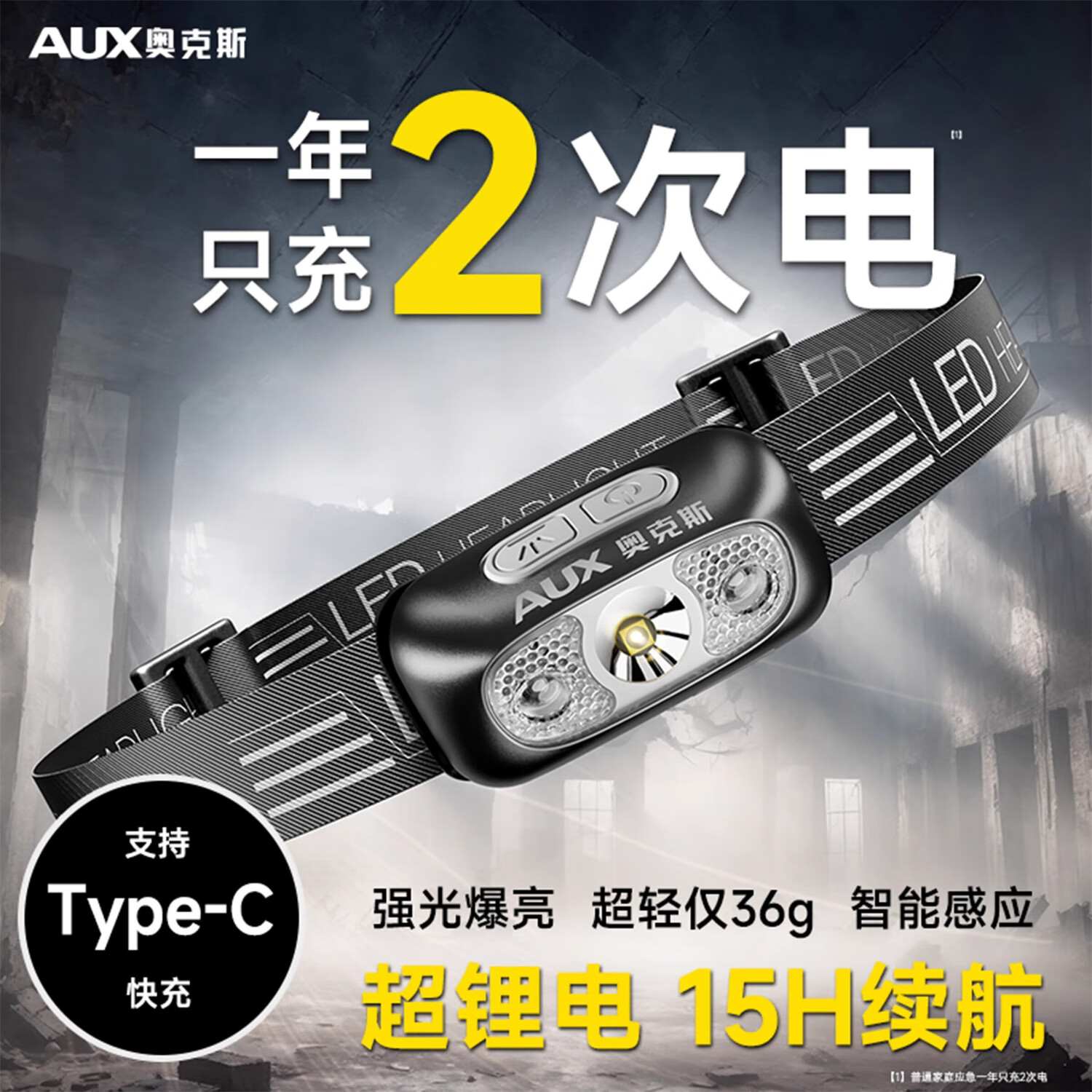 奥克斯(AUX)头灯强光夜钓灯超亮防水超长续航户外工作照明钓鱼专用感应头灯 顶配爆亮N9灯珠(续航10-15h)