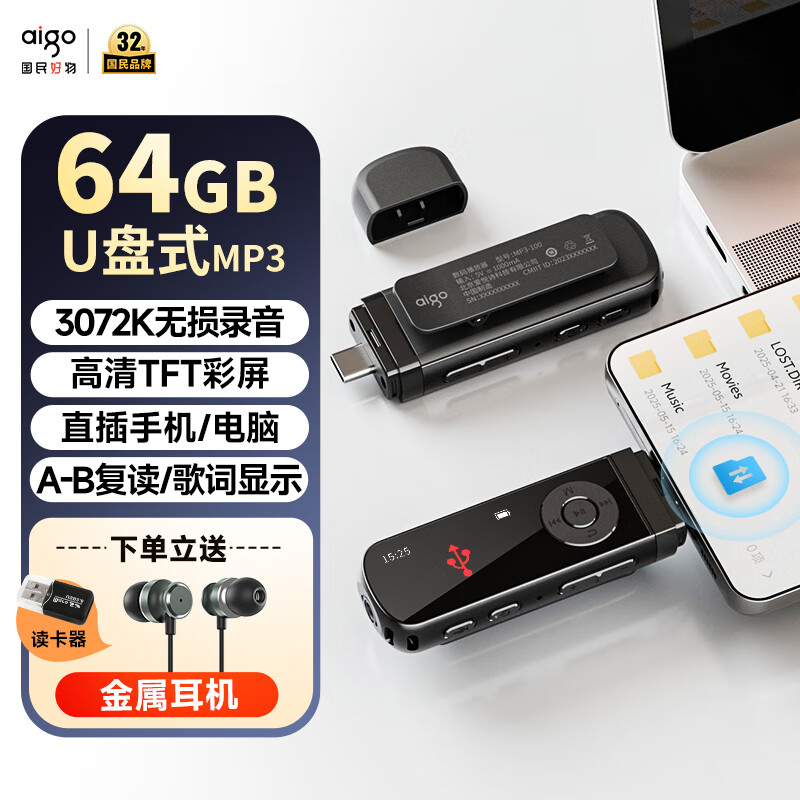 爱国者(aigo)mp3-100 64G便携mp3音乐播放器 mp4蓝牙学生随身听英语运动跑步录音U盘式USB-C口 可扩容