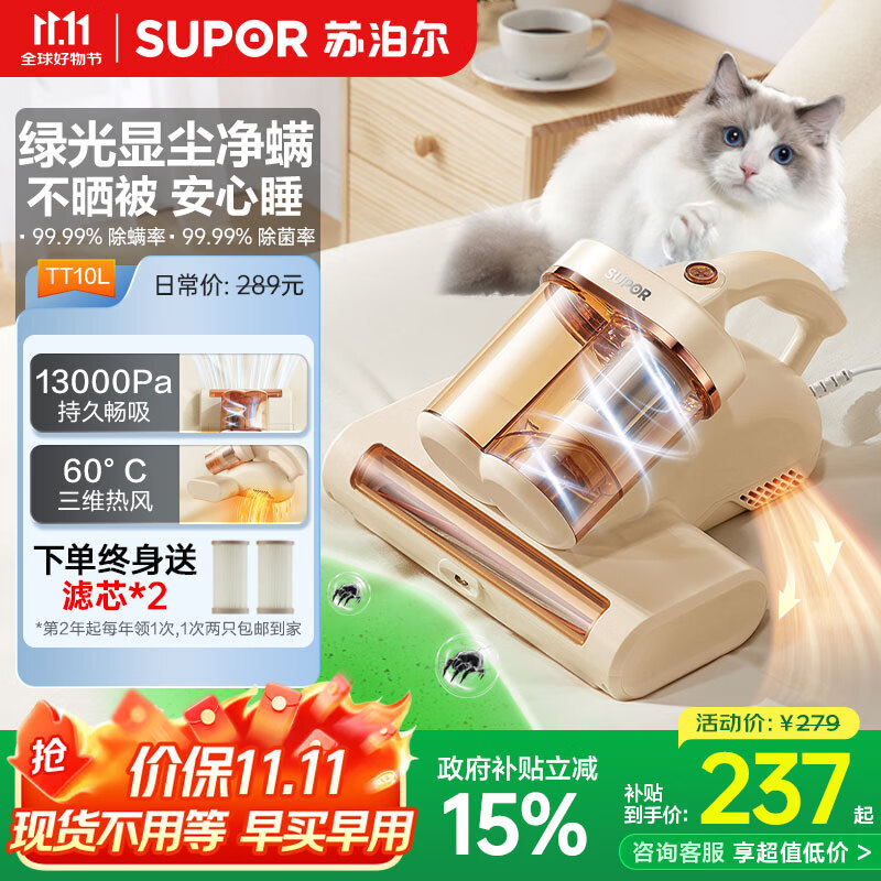 苏泊尔除螨仪床宝双杯尘螨分离家用床上紫外线杀菌除螨超声波去螨大吸力吸尘神器TT10L国家补贴