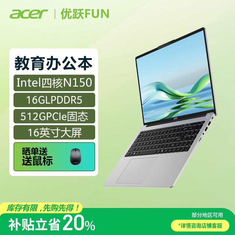 宏碁优跃FUN大屏笔记本电脑 16英寸商务办公学生电脑(Intel四核N150 16G 512G)