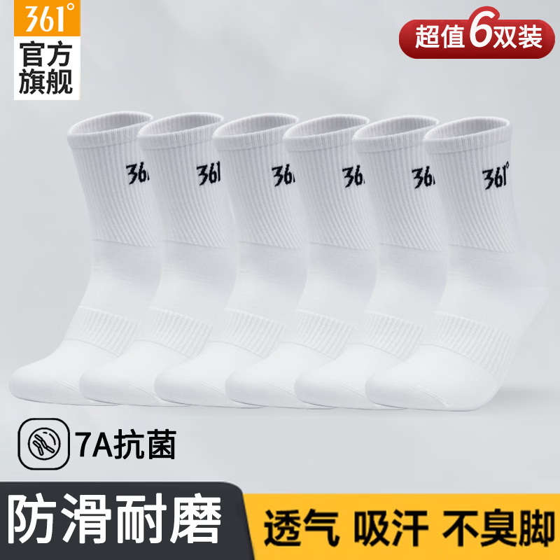 361°正品运动袜子新款消臭棉袜吸汗跑步休闲长筒袜 白色-6双装 均码