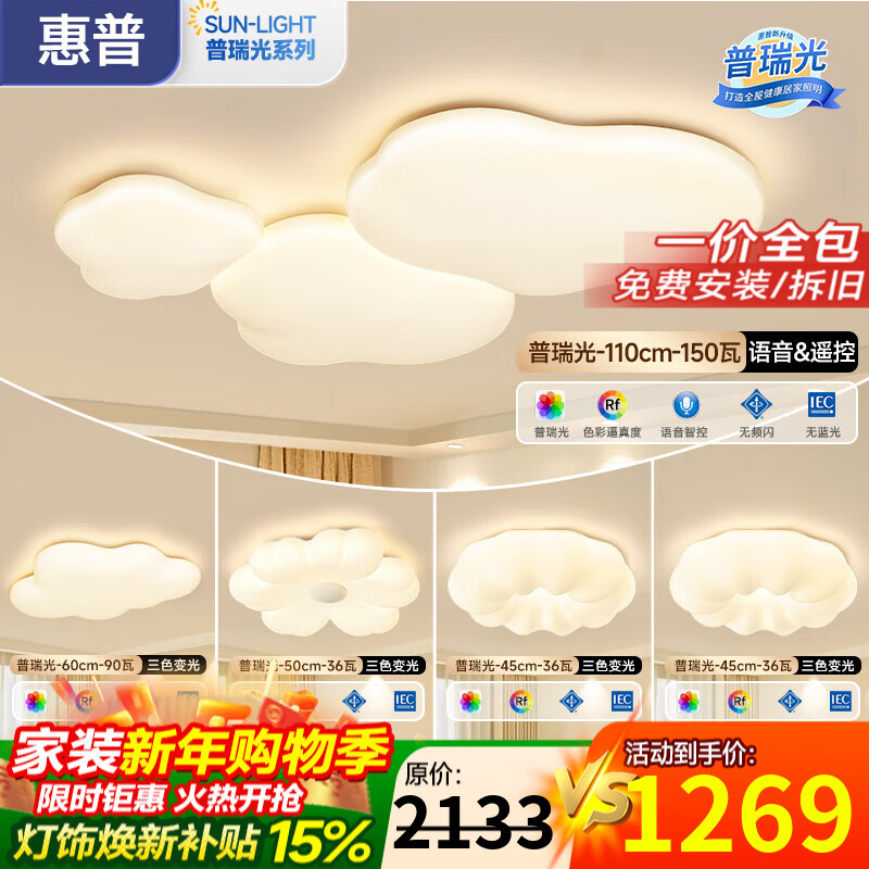 惠普普瑞护眼LED客厅大灯吸顶灯云朵奶油风智能灯具全屋套餐中山 5灯:普瑞110客厅智控/四室一厅H