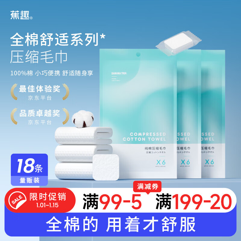 蕉趣(BANANA TRIP)纯棉一次性压缩毛巾加厚加大洗脸巾旅行出差洗澡毛巾30*70cm 18条