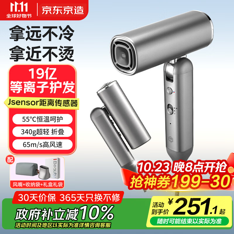京东京造beauty高速吹风机折叠Fold银 19亿等离子吹风机家用静音负离子大功率护发电吹风筒生日礼物男