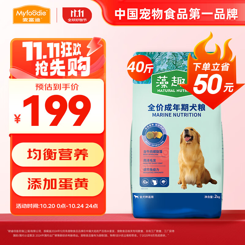 麦富迪 狗粮 藻趣儿通用全价犬粮小中大型犬泰迪柯基金毛拉布拉多 【新升级蛋黄双拼】成犬粮40斤