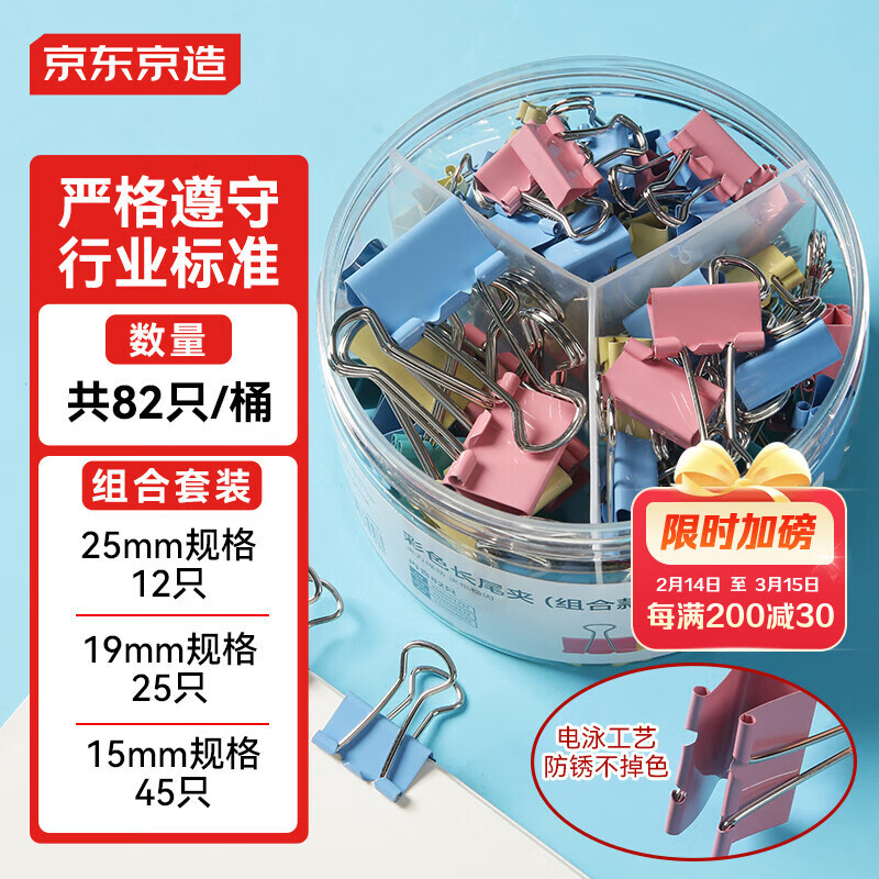 京东京造 长尾夹燕尾夹 彩色混合装15mm+19mm+25mm(82只组合) 票夹凤尾夹蝴蝶夹金属票据文件夹