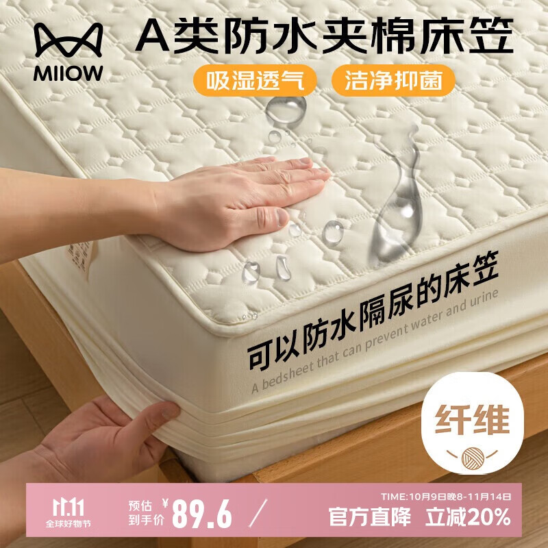 猫人A类防水隔尿夹棉床笠单件床单防滑加厚床垫保护套1.8米床